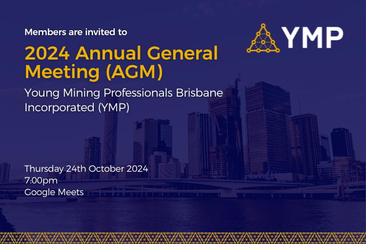 Notice is given for the 2024 Annual General Meeting (AGM) for Young Mining Professionals Brisbane Incorporated (YMP). The AGM is scheduled to be held on Thursday, 24th October 2024 at 7:00pm AEST online via Google Meets with the following business to be conducted: